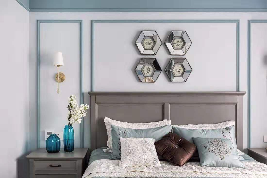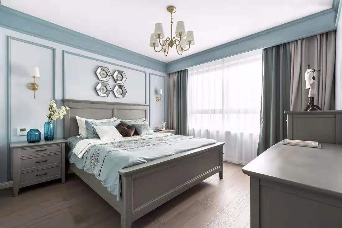 主臥,淡藍(lán)色的臥室可以安撫身心的疲憊,搭配灰藍(lán)色的美式家具,優(yōu)雅而清新。