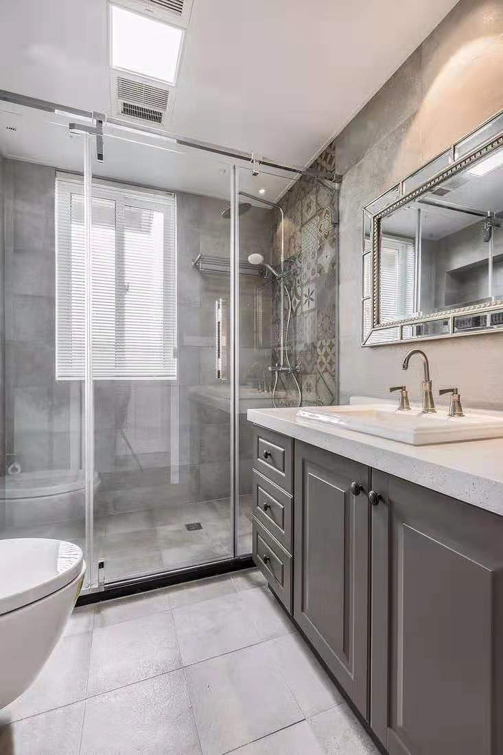 主衛(wèi)設(shè)置了淋浴隔斷,灰色的衛(wèi)浴柜搭配白色的臺(tái)面,低調(diào)簡(jiǎn)潔。