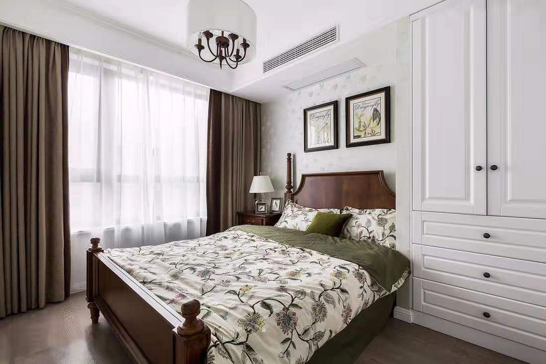 次臥則是選擇了棕色的美式家具、綠色的床品、卡其色搭配白紗的窗簾,走的還是清爽和溫暖路線。